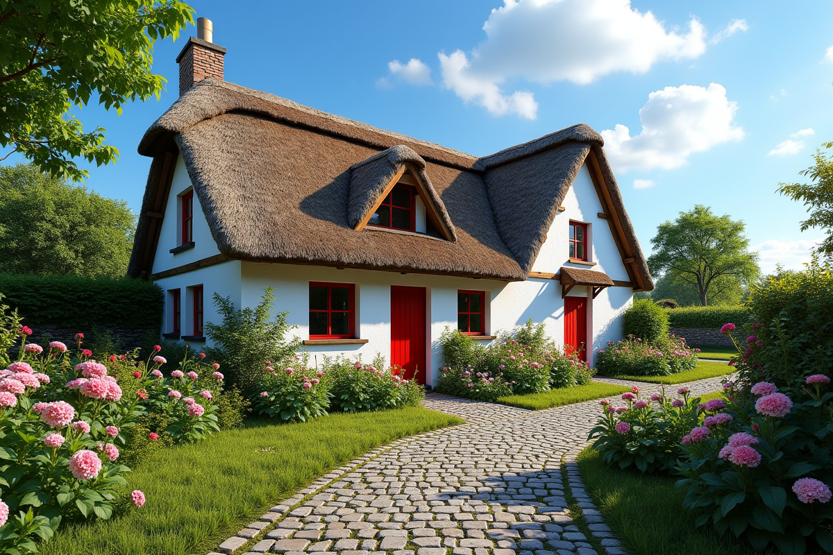 La chaumière bretonne, avec son toit de chaume, évoque une atmosphère conviviale et onirique. Ces maisons, souvent dotées de petites fenêtres et de poutres apparentes, sont le reflet de l’art de vivre à la bretonne. Les chaumières sont particulièrement présentes dans les Côtes d’Armor et l’Ille-et-Vilaine, et attirent par leur charme rustique et leur authenticité.